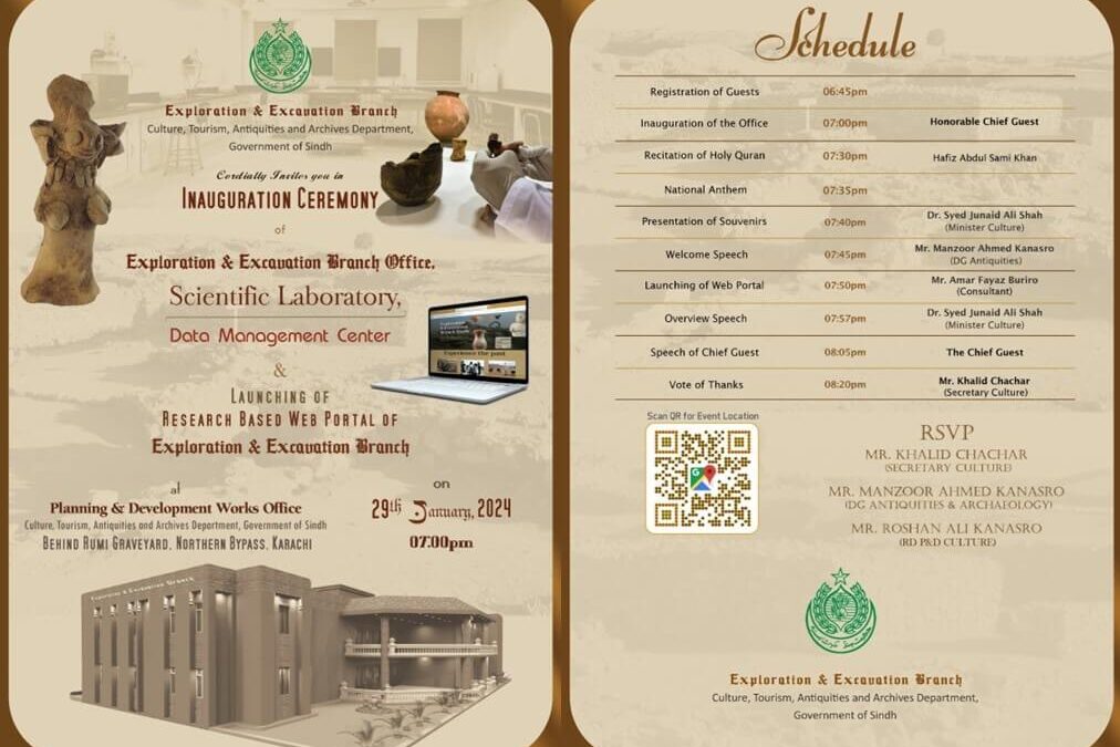 Exploration & Excavation Branch, Culture, Tourism, Antiquities and Archives Department, Government of Sindh Cordially Invites you in Inauguration Ceremony of Exploration & Excavation Branch Office, Scientific Laboratory, Data Management Center & Launching of Research Based Web Portal of Exploration & Excavation Branch on 29th January, 2024 07:00pm at Planning & Development Works Office Culture, Tourism, Antiquities and Archives Department, Government of Sindh Behind Rumi Graveyard, Northern Bypass, Karachi.